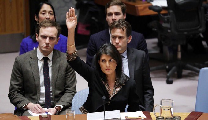 After the vote, U.S. Ambassador to the United Nations Nikki Haley said the U.S. does not veto resolutions lightly and that this was her first veto -- that it stood for "American sovereignty" and its role in the Middle East peace process.
